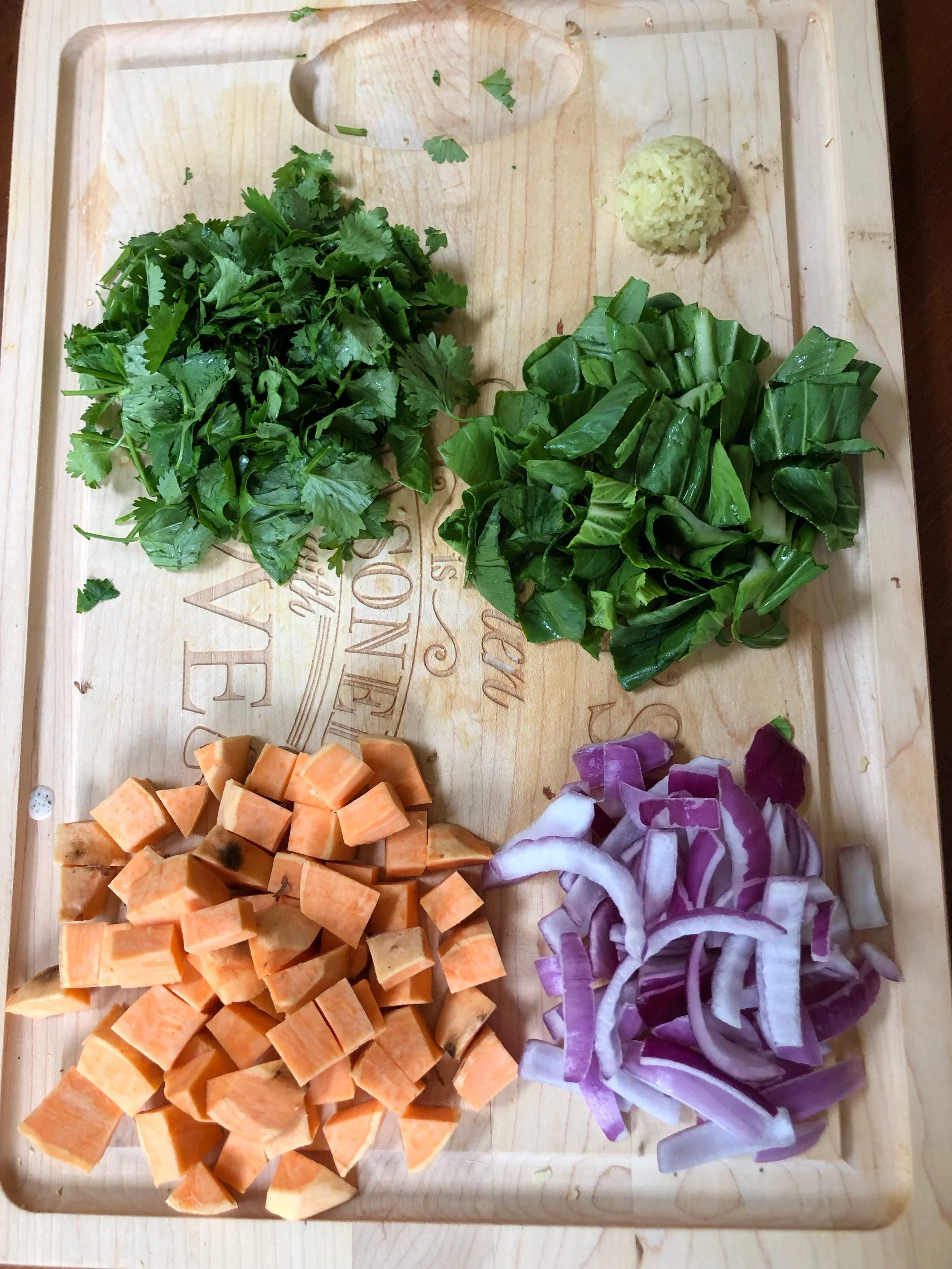 3. Add the vegetable broth along with the chopped bok choy and diced sweet potatoes. Bring the pot to a boil then reduce the heat to low and simmer for 7-10 minutes or until the sweet potatoes are tender.